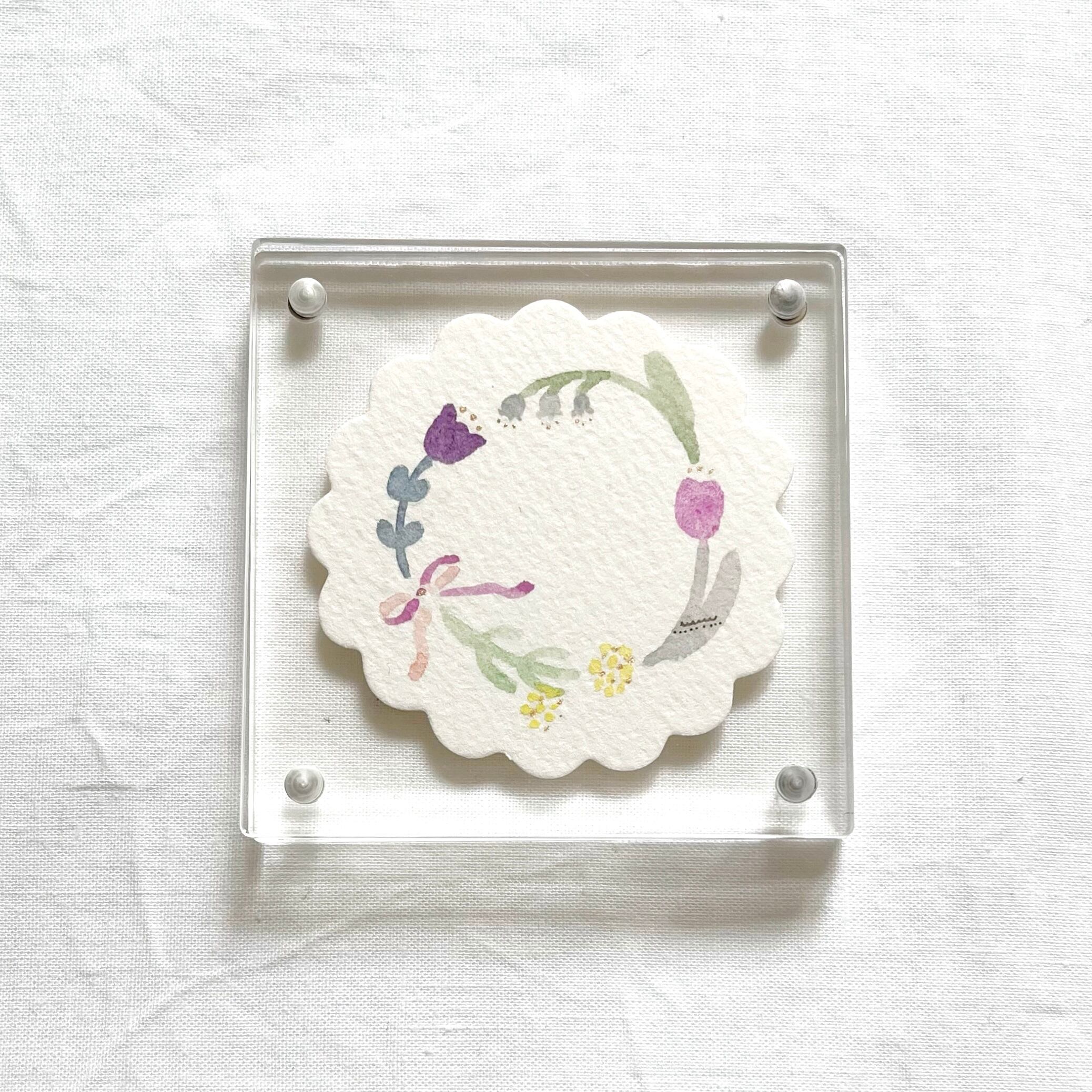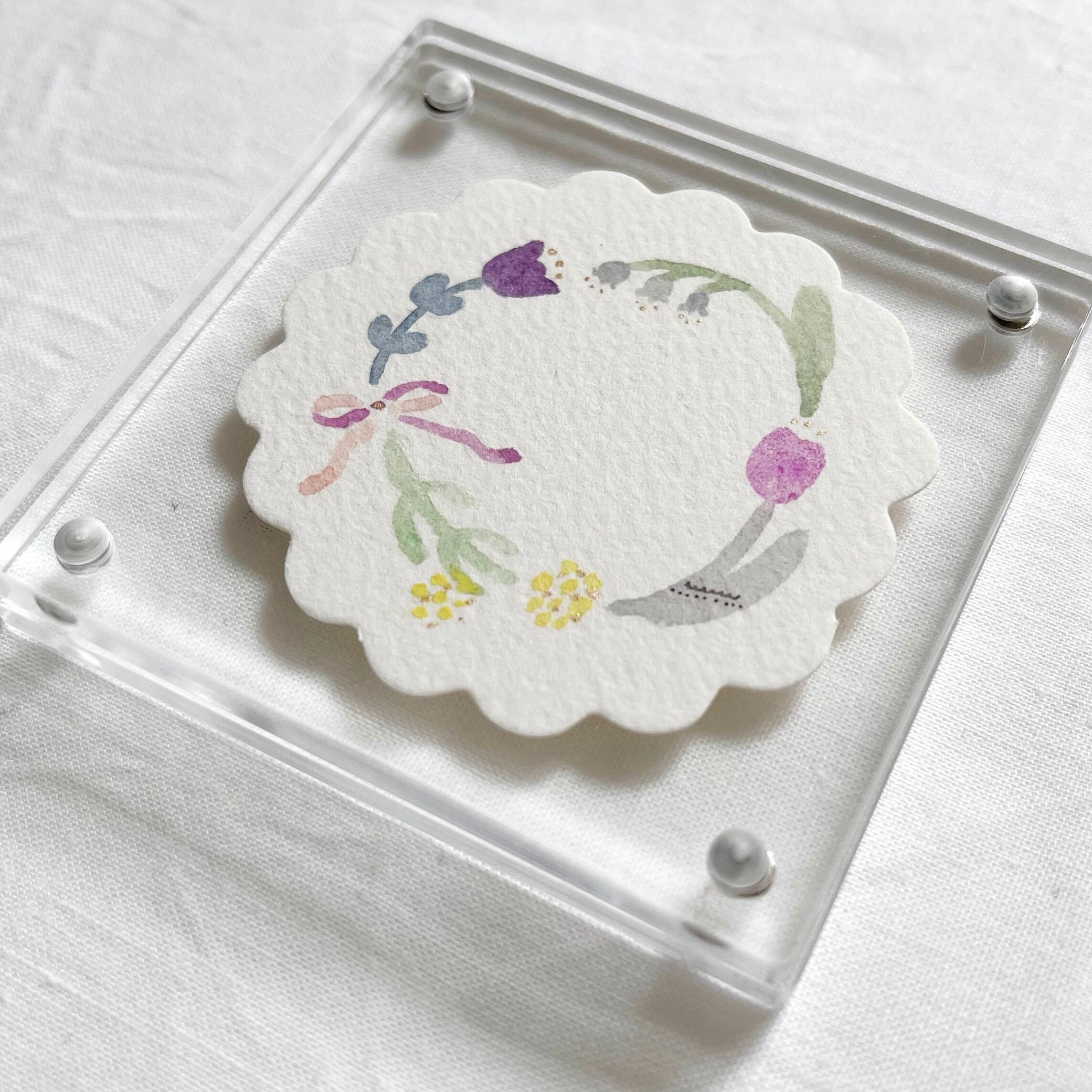 スカラップカットしたお花の絵をアクリルフレームに閉じ込めた水彩ミニ原画です。